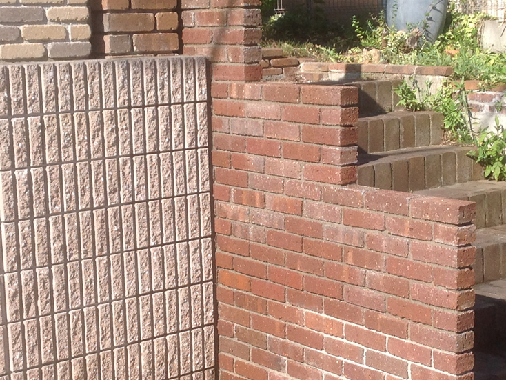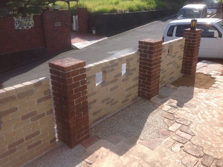 駐車スペースを広げたいとご依頼頂きました。 土間には既存で使用してましたヴィンテージレンガよりも色の濃いオンリーワンのキルンブリックと洗い出しで仕上げました。 土留には化粧ブロックを使用し、転落防止のためにレンガで塀と角柱をデザインしました。