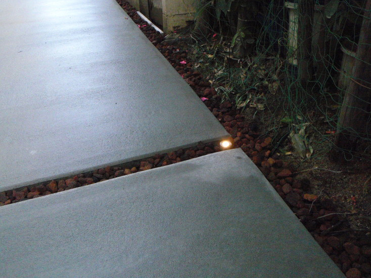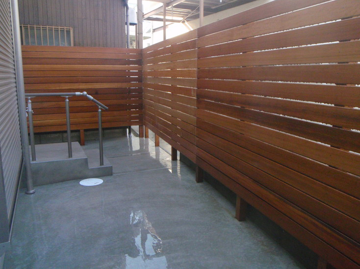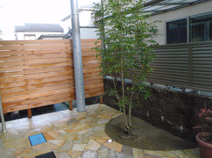 アプローチとガレージはシンプルにコンクリート仕上げで、 くつろぎの空間は目隠しにハードウッドの木製フェンスを使用し土間には自然石を乱張りしました。 「門柱は出来るだけコンパクトに。」とご要望がありましたので塗り壁と自然石で可愛く仕上げました。 表札にはオンリーワンのフォレストヒルズネームプレートを使用してます。
