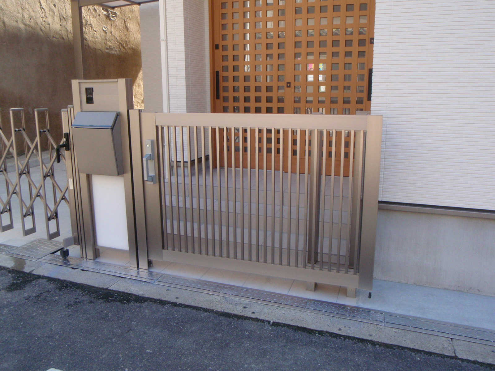 シンプルなクローズ外構です。 門扉は奥行が無いため引き戸を使用し、ガレージ扉はアコーディオン門扉を使用しました。猫の糞が気になる為、外周はコンクリート仕上げにしました。 糞害が減って喜んでいただきました(*´∀`*)