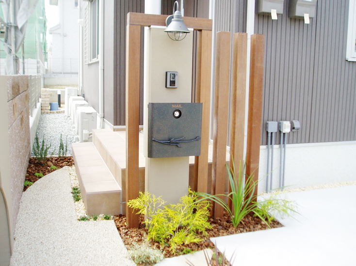 エクステリア工事をおこないました。 かわいいらしいデザインの外壁や立すい栓、オシャレな門柱とテラスに仕上げました。